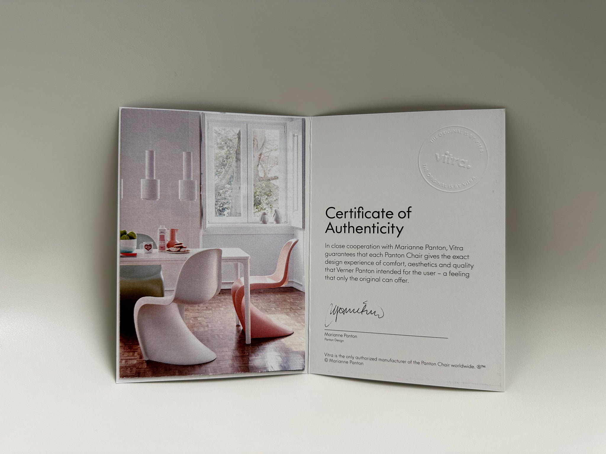 Die 41-cm-Version vermittelt ein Sitzgefühl, das vielen Original-Mid-Century-Interieurs entspricht. Sammler und Puristen bevorzugen diese Variante, weil sie die ursprüngliche Proportion und Bodennähe bewahrt. Seit 2021 wird der Panton Chair von Vitra in 44 cm produziert – die hier angebotene alte Sitzhöhe ist entsprechend selten.
